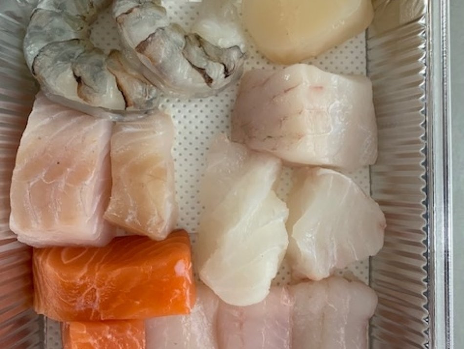Bestaat uit zalmfilet, kabeljauwfilet, zeewolffilet, tongfilets, zeeduivel, coquilles en scampi