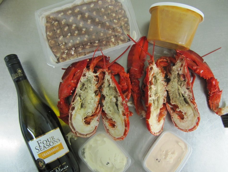 Deze box bestaat uit: 2 stuks gekookte canadese kreeft van 550gr, 1/2 liter bique van kreeft (diepvries), 2 pp dessert, 1 fles witte huiswijn, mayonaise en cocktailsaus